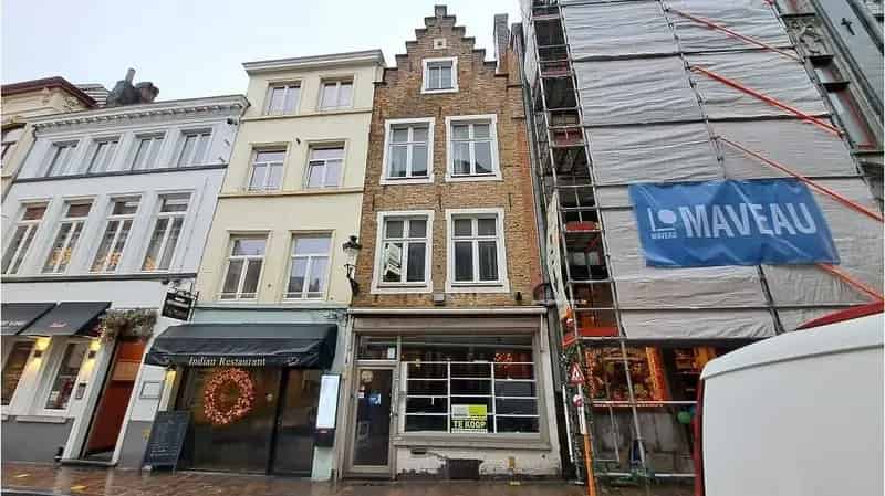 Handelspand met woonst op een commerciële en toeristische goede ligging, op wandelafstand van de Grote Markt en de Burg, in de schaduw van het Belfort, Het Provinciaal Hof en het stadhuis, met brede gevel en goede zichtbaarheid door zijn hoekligging.